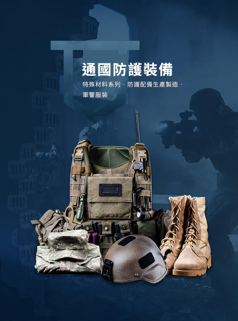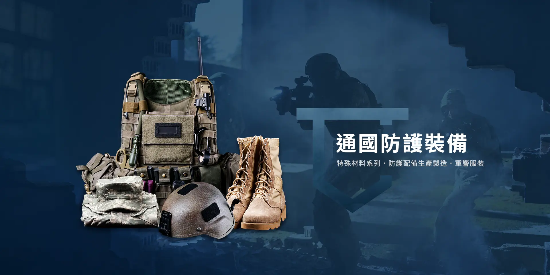 通國開始軍用裝備製造,如鋼盔、S腰帶、水壺…等。現在通國是國內及海外市場的防彈專業供應商,我們防彈產品是由杜邦公司 Kevlar 材料及 PE 材料,依據美國 NIJ 及 MIL 標準製成。我們主要產品包括防彈頭盔、防彈衣、防彈盾牌、鎮暴裝備及其他用軍用裝備。